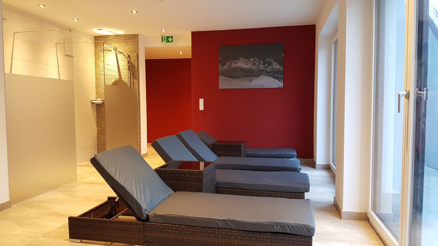 An attractively designed atrium will allow to go outside after sauna to enjoy the fresh air and the views of the Wilder Kaiser.